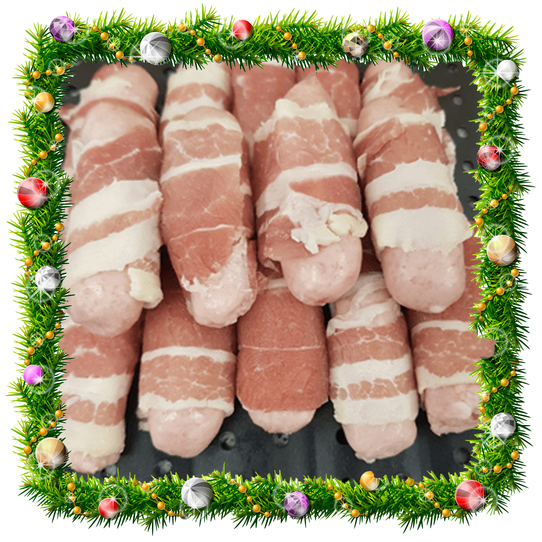 These are hand made using our chipolata sausages wrapped in streaky bacon.